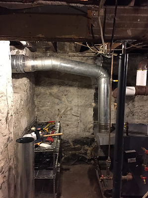After removing the internal chimney, the boiler vent was redirected outside through the old coal shoot and then routed above the roofline (see below). We miscalculated when sizing the chimney and eventually had to install a draft inducer (not shown) to ensure the boiler would exhaust outside. I appreciate the error because now the draft inducer provides one more safeguard preventing CO buildup inside the house.